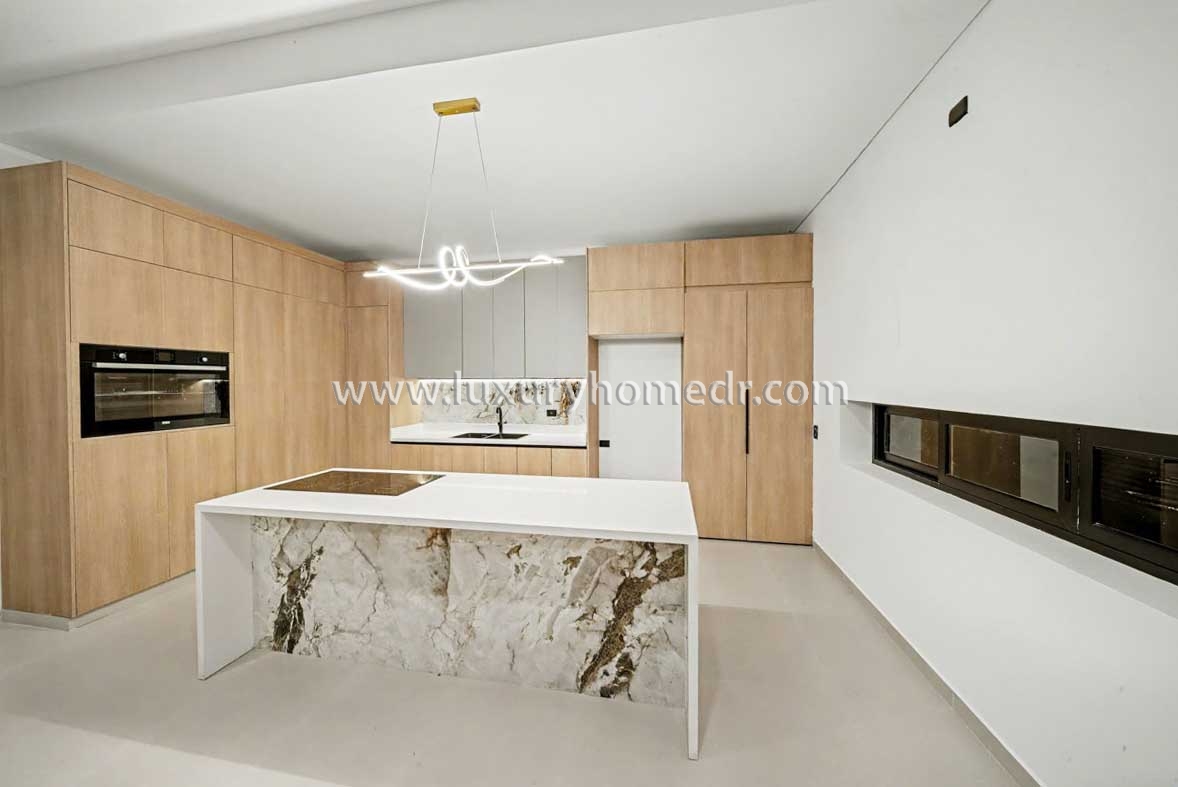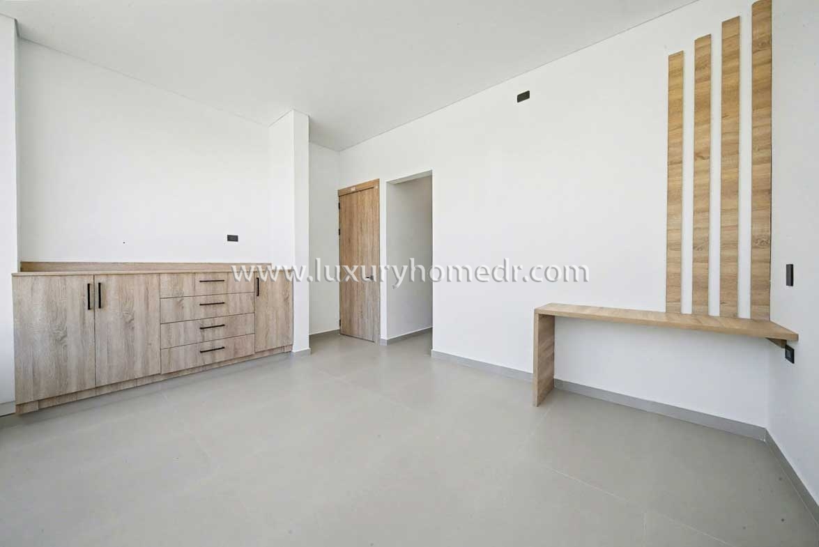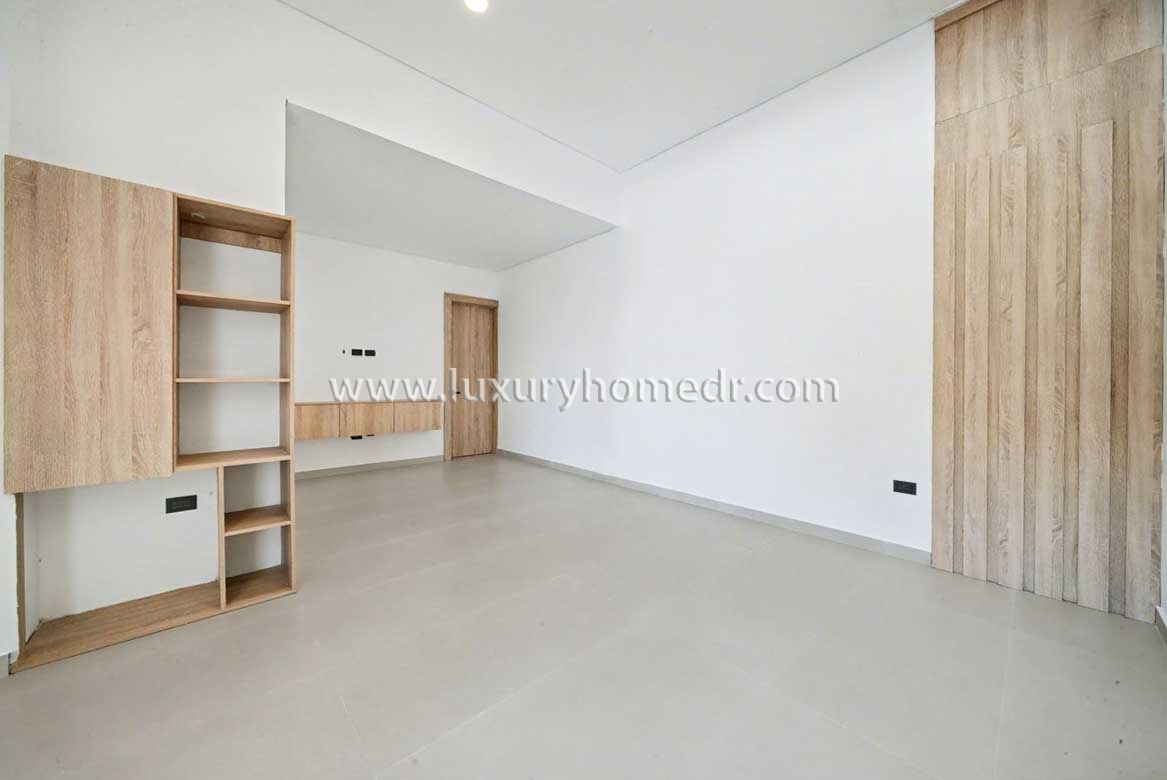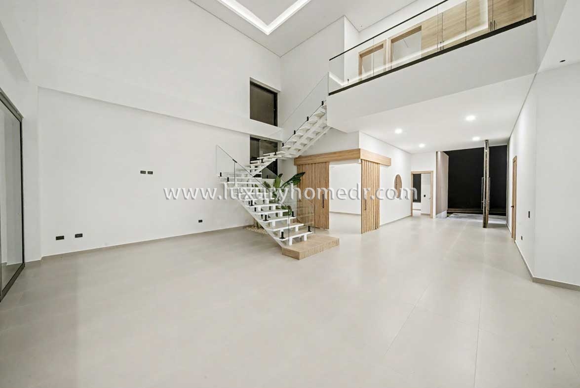 A magnificent double-height living room (8 meters) adds light and grandeur to the central social area. A custom-designed chandelier hangs at the center, enhancing the feeling of space and luxury. Consistent use of finishes throughout the interior and terrace allows for seamless indoor-outdoor integration. On the second floor, you’ll find a Family Entertainment Zone, pre-wired for a home cinema, gaming area, and snack bar, complete with custom cabinetry and media setup. The space is designed to accommodate 5.1 surround sound and a projector or large-screen TV.