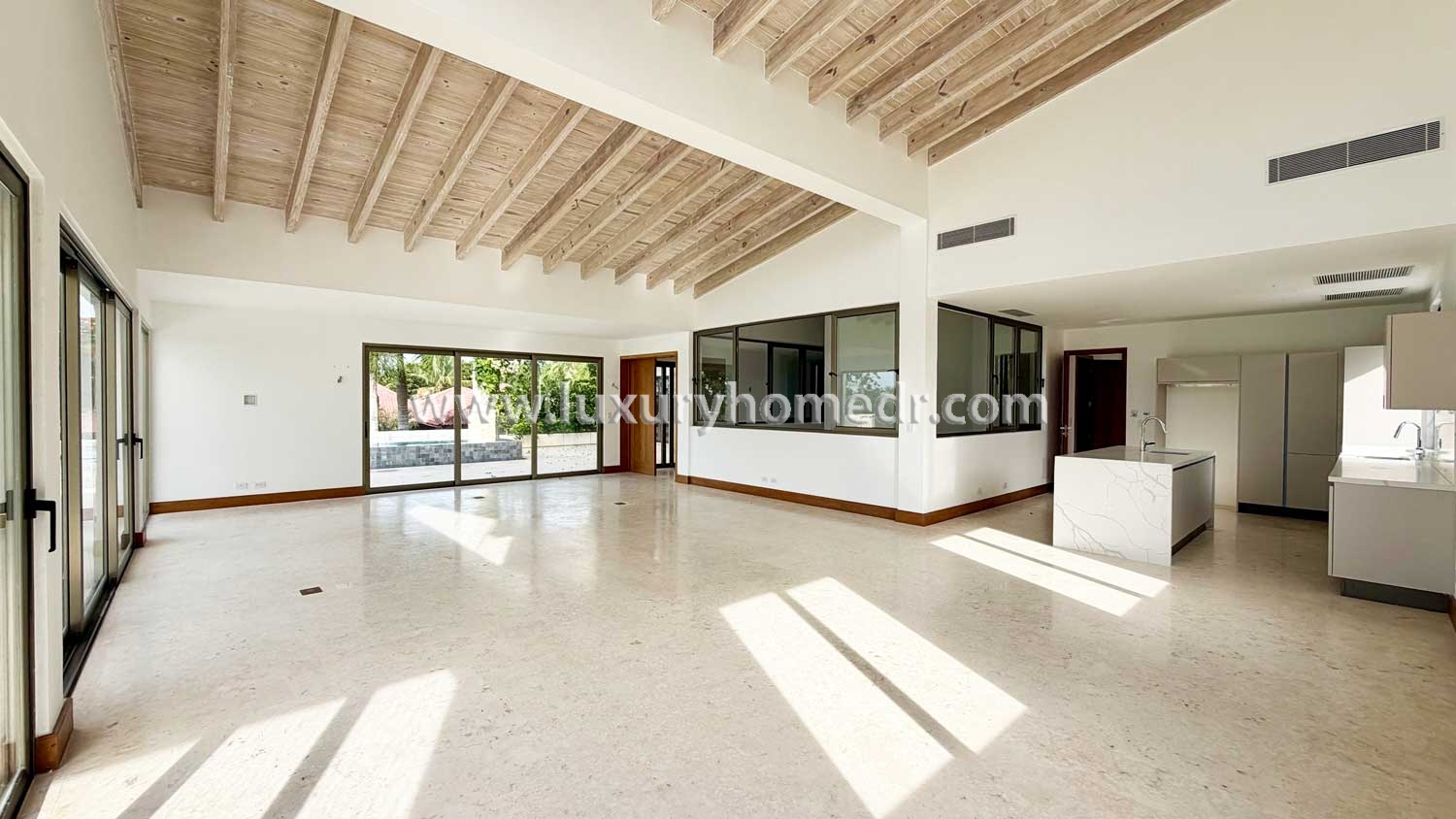 The living spaces feel open and inviting. Wide glass doors connect the interior with the outdoor areas. As a result, the home feels bright, airy, and perfectly integrated with the surroundings.