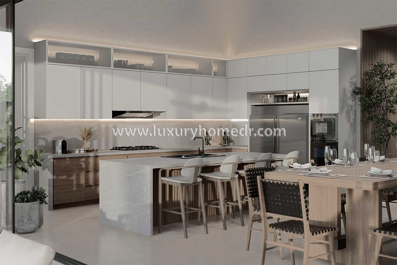 The dual kitchen concept includes a fully equipped hot kitchen and a separate cold kitchen. This setup enhances entertaining possibilities and everyday convenience.